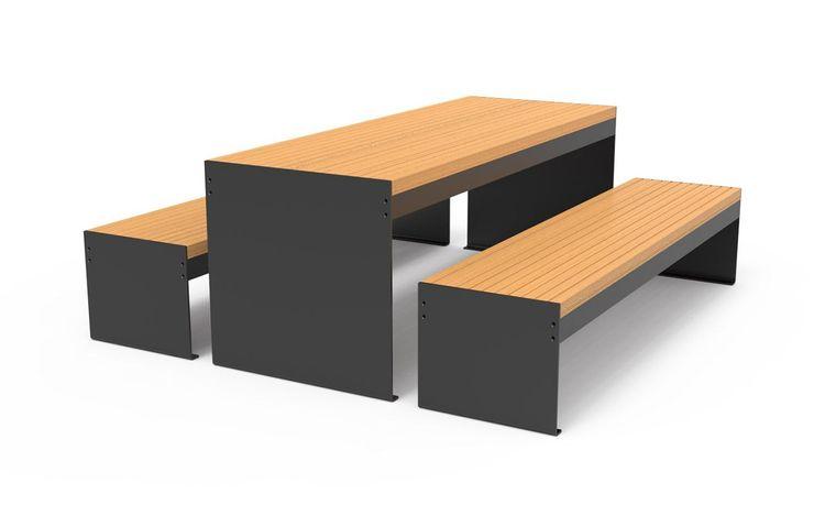 Table set plus two seats, with steel frame and slats in a choice of aluminium or wood: the structure consists of two side legs made of 8 mm thick galvanised sheet metal and an internal frame for fixing the slats, the table is equipped with 17 staves, while the seats have 11. The staves can be chosen between wood and aluminium, both have a section 50x40mm.