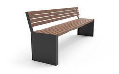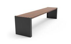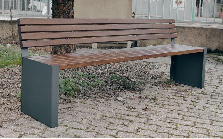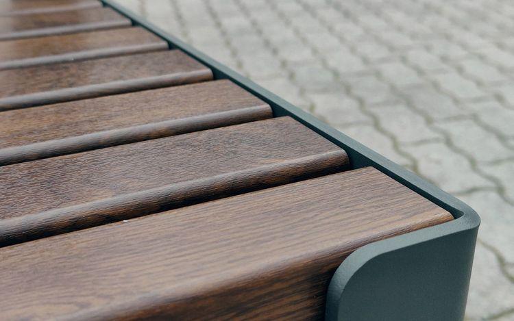 Bench composed of a galvanised and powder-coated 6 mm thick steel plate structure. The staves that make up the seat are 40x50 mm section and 2 mm thick aluminium covered with Renolit PVC film with a wood-effect finish. The finish is non-porous (thus preventing the formation of mould), anti-graffiti and resistant to indelible writing, exposure to open flames and easy to clean. It does not discolour and does not undergo significant weathering.