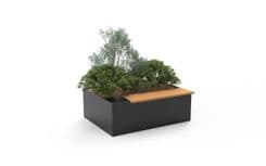 Planter with recessed seat. The structure of the planter is made of galvanised steel and is equipped with a container and a frame for fixing the staves. The seat is recessed inside the structure of the planter and is composed of 20 tropical wood staves with a 40x50mm section.